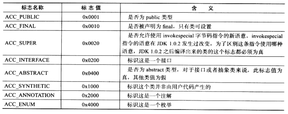 访问标志(access_flags)用于识别类和接口的访问信息,诸如是否是public及抽象类等。