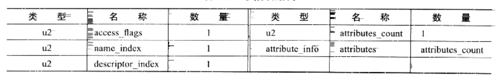 字段表的结果除了访问标志描述,还有字段的简单名称 name_index 及方法的描述符 discriptor_index、属性表统计 attributes_count 及属性表 attributes。