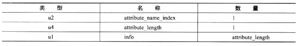 | u2 | attributes_name_index | 指向 CONSTANT_Class_info 常量索引,表示该属性表名称 |