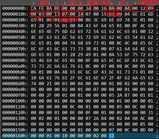 常量池开始是容量说明,u2类型,及 00 16,表示容量为 16+6=22-1=21,因为常量池容量计算是从1开始,0表示为空。