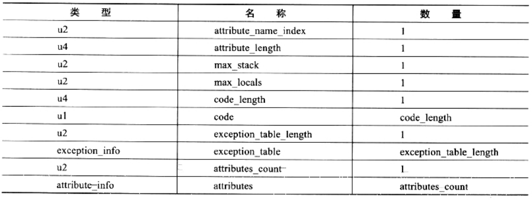 | u1 | code | 一些类的字节码指令,用于描述编译后的方法体内方法。 |
