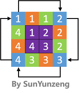 对于四阶矩阵,先从最外圈i=0开始,到里圈i=1结束。n+1阶矩阵从最外圈i=0开始,i=n/2里圈结束。